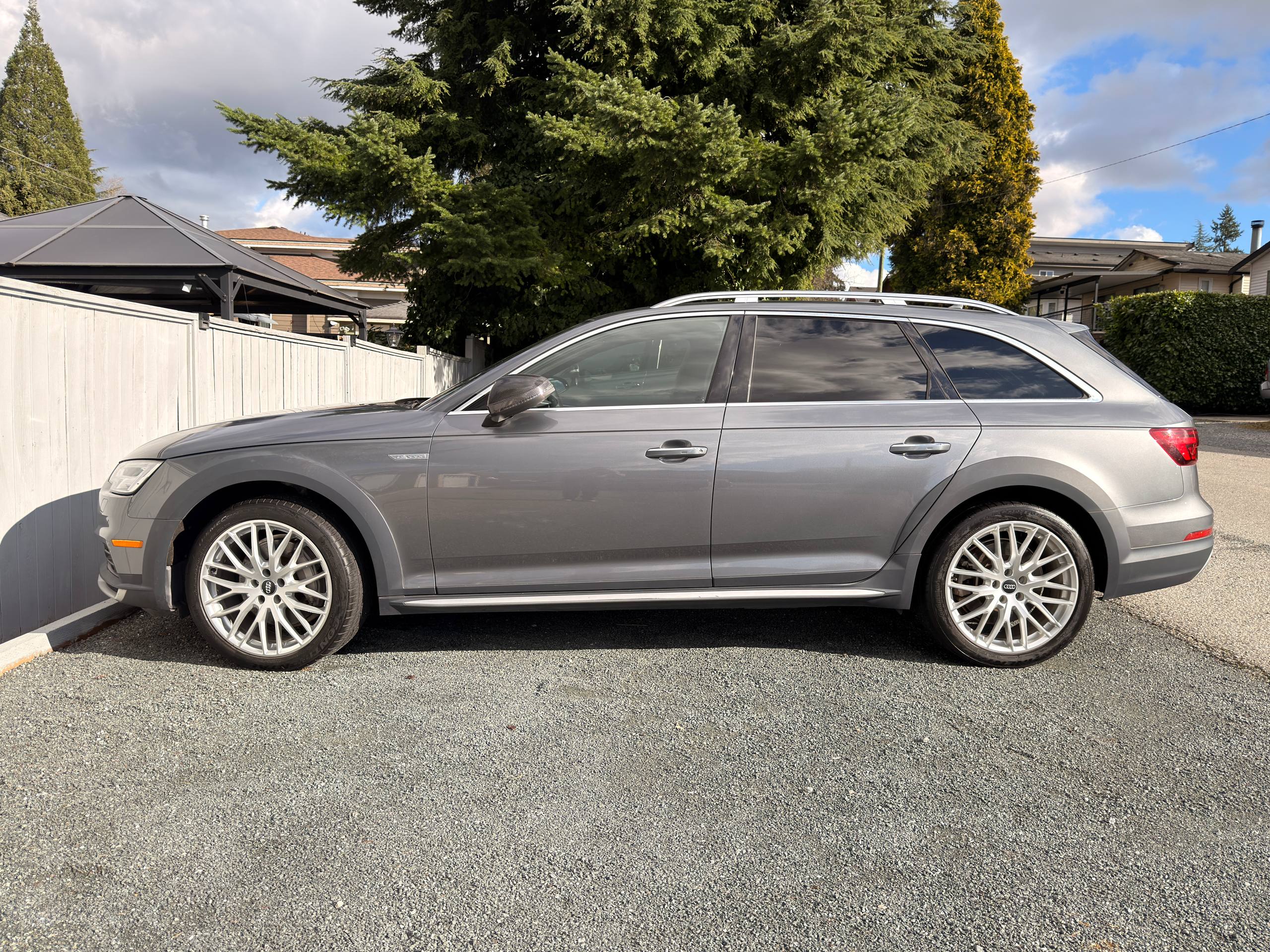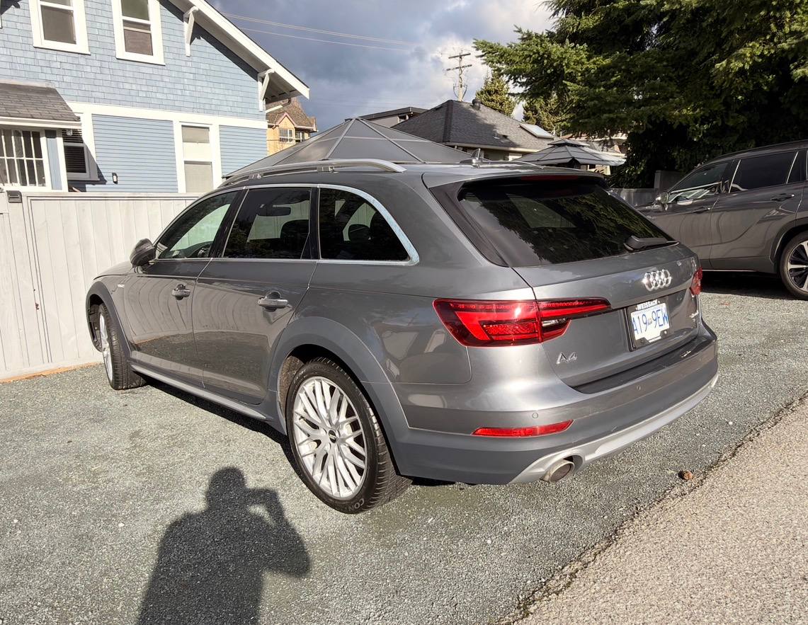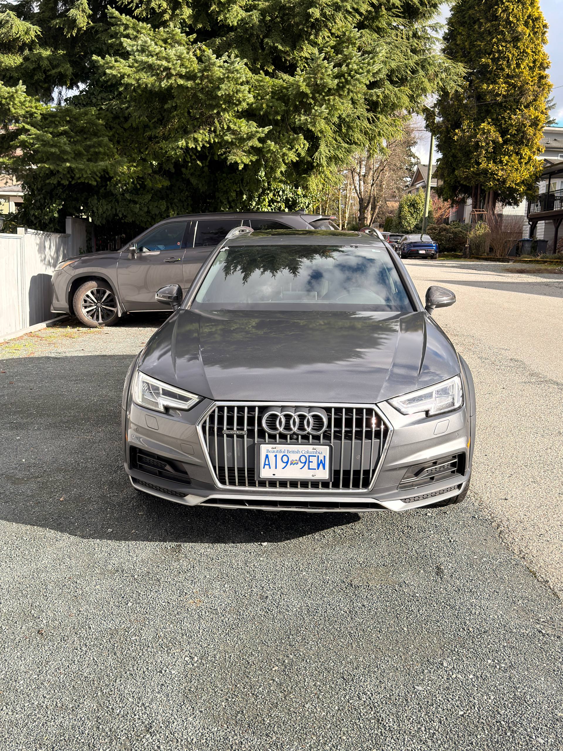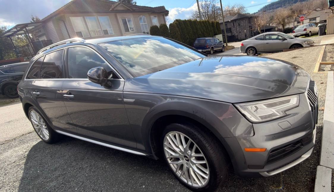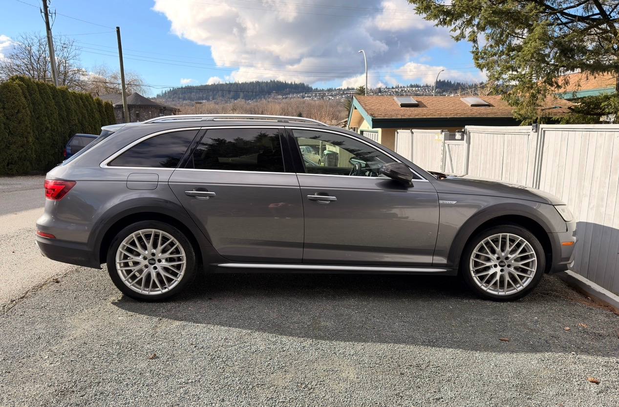 Canadian stock vehicle available in Vancouver, BC. 2018 Audi A4 Allroad Quattro Technic finished in grey with a black interior and low mileage for the year. The photo set shows a panoramic roof, digital cockpit, navigation, rear camera, leather interior, and Quattro all-wheel drive. Suitable for local purchase in Canada or export on request.