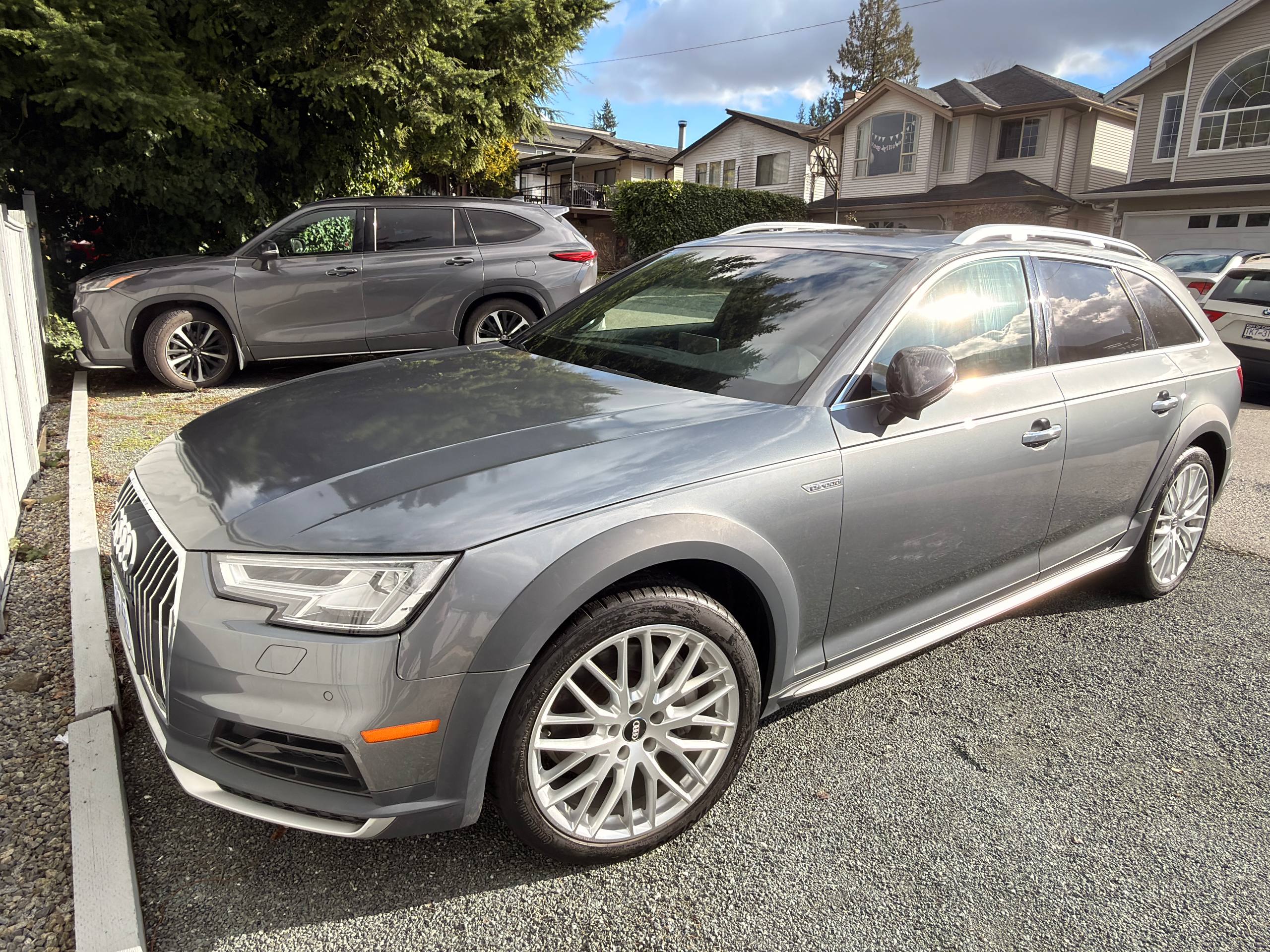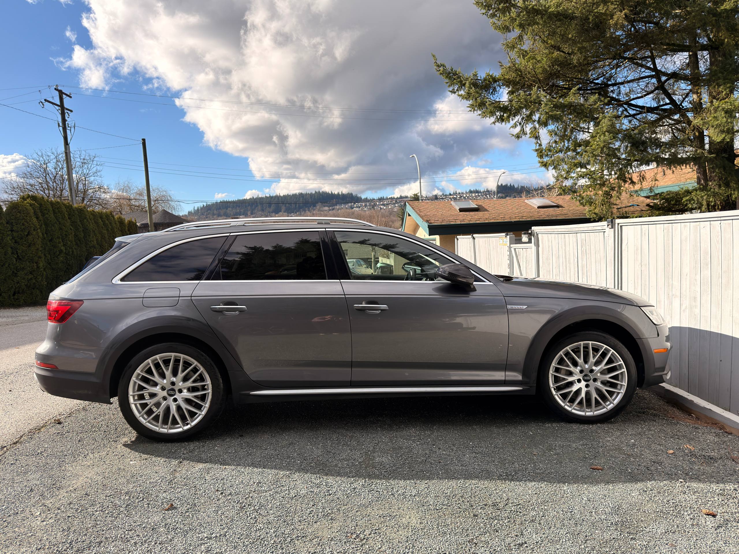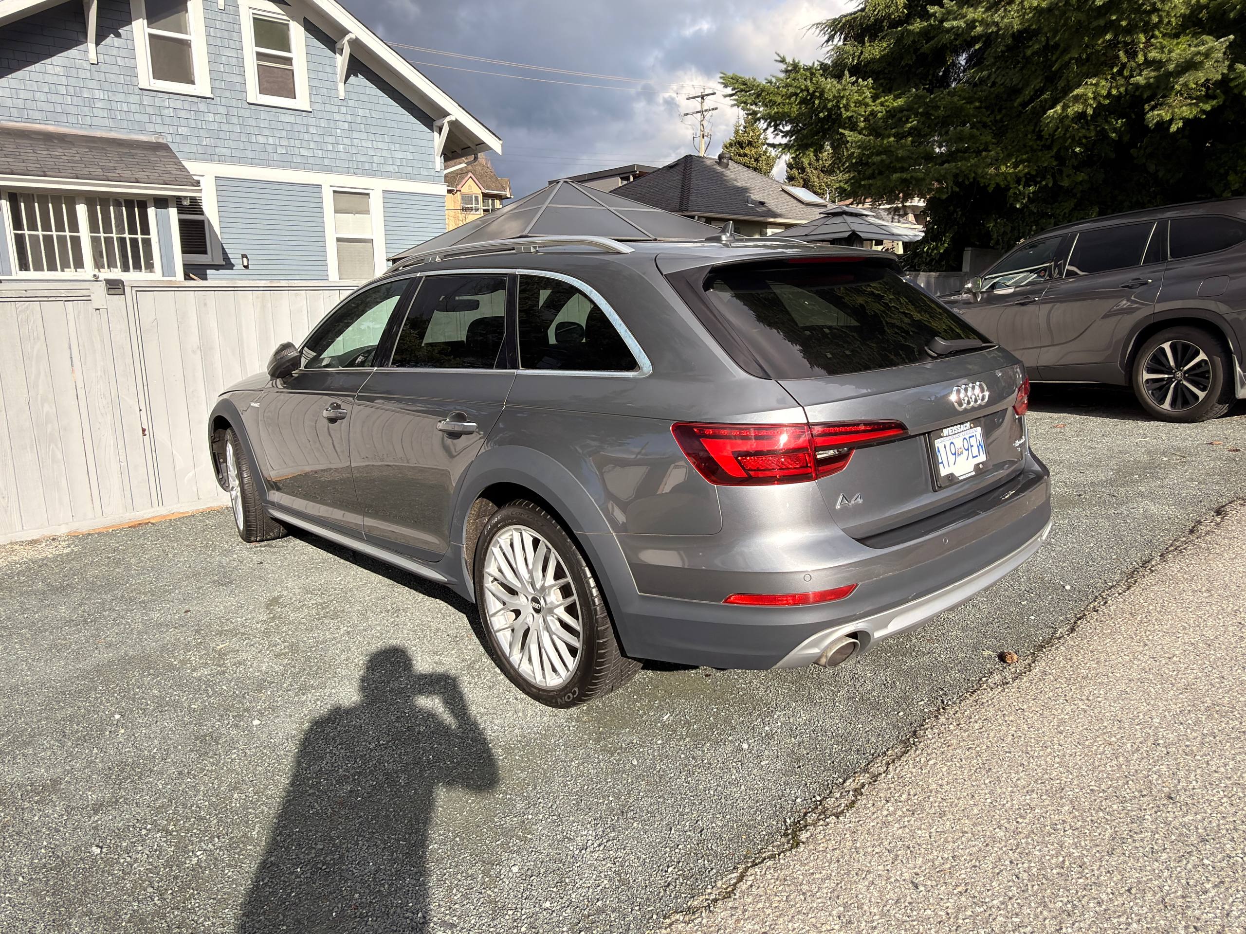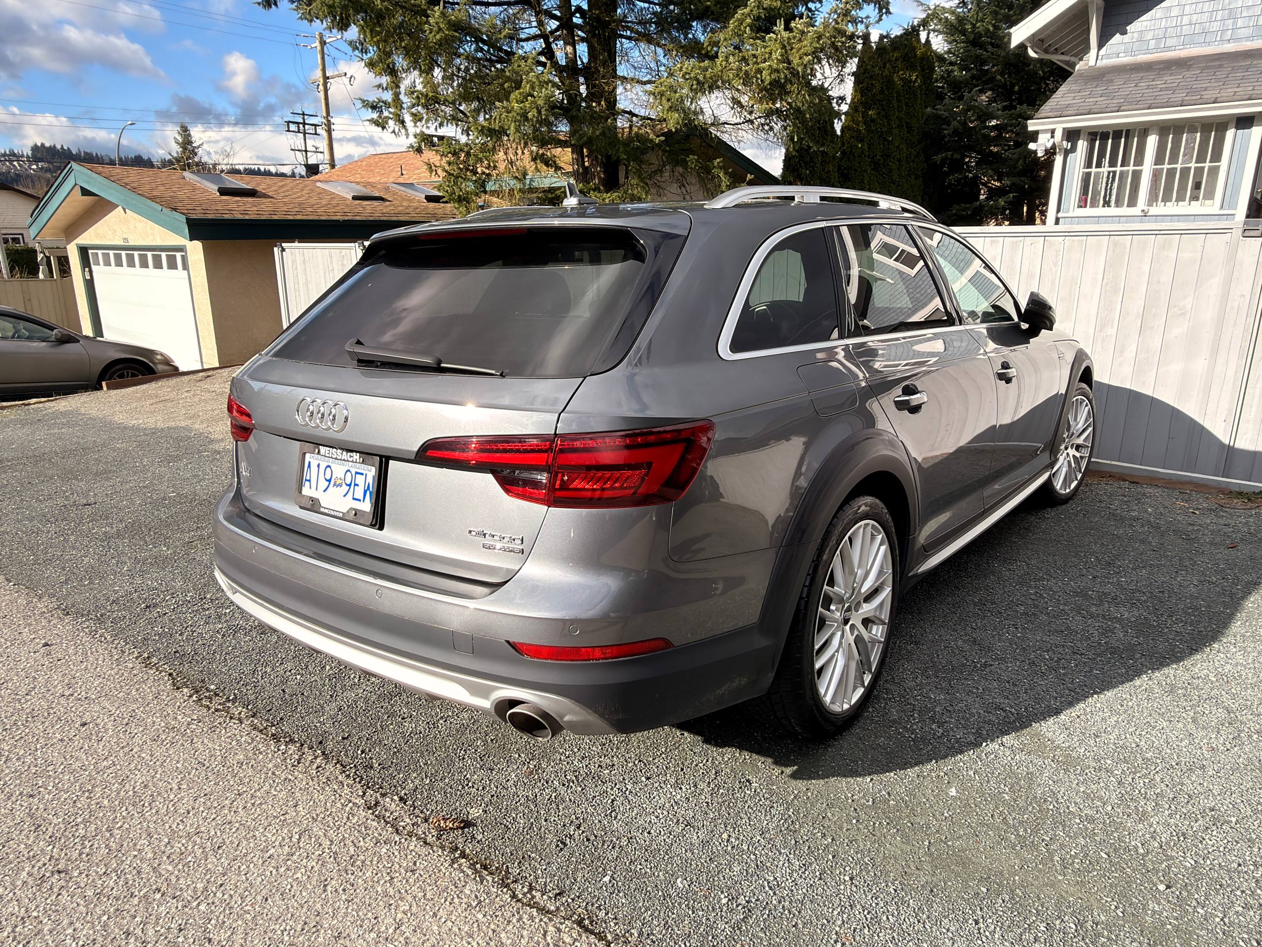 Canadian stock vehicle available in Vancouver, BC. 2018 Audi A4 Allroad Quattro Technic finished in grey with a black interior and low mileage for the year. The photo set shows a panoramic roof, digital cockpit, navigation, rear camera, leather interior, and Quattro all-wheel drive. Suitable for local purchase in Canada or export on request.