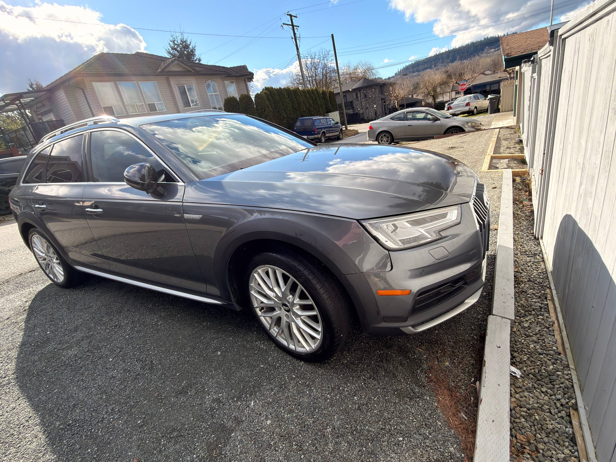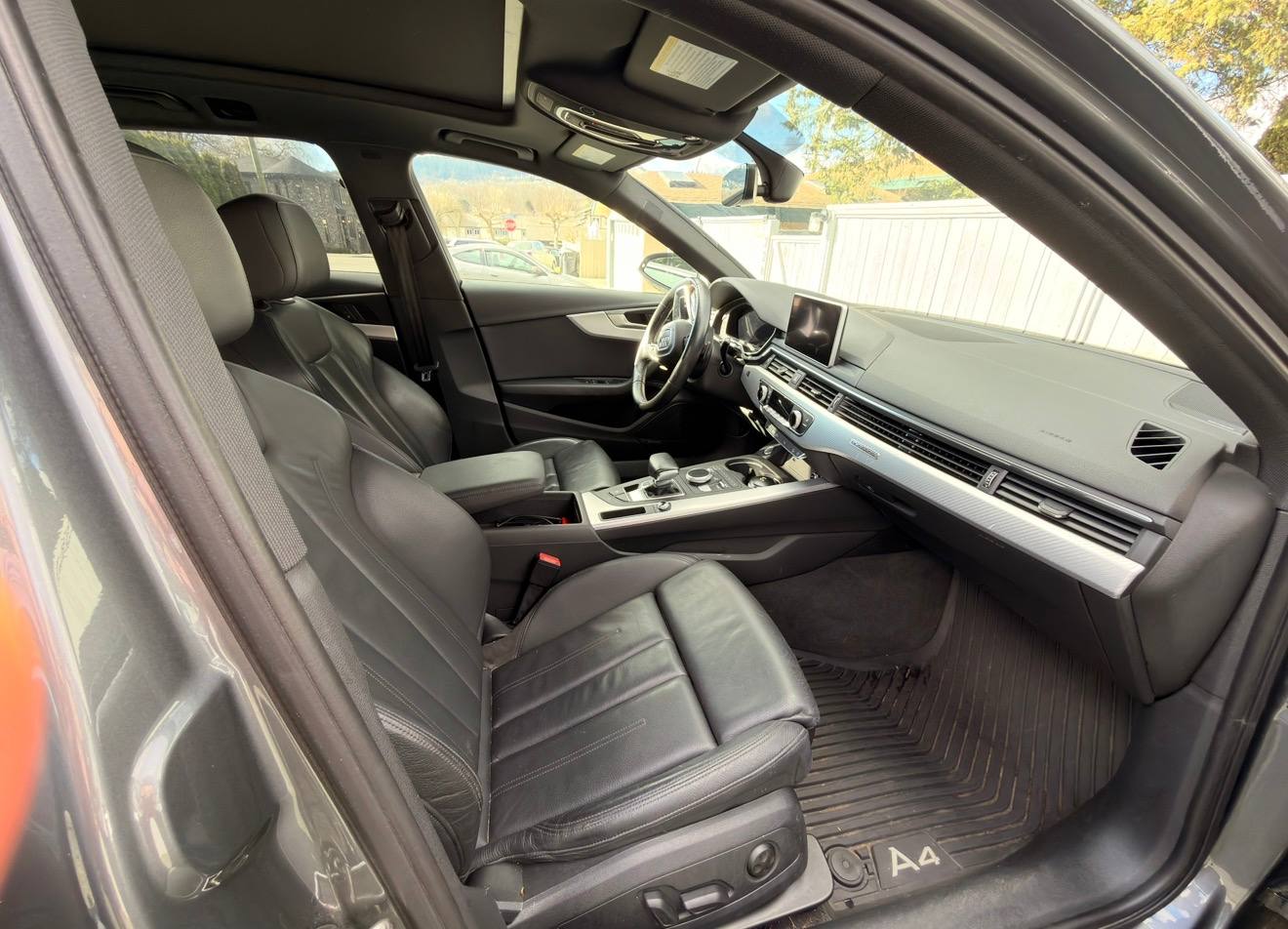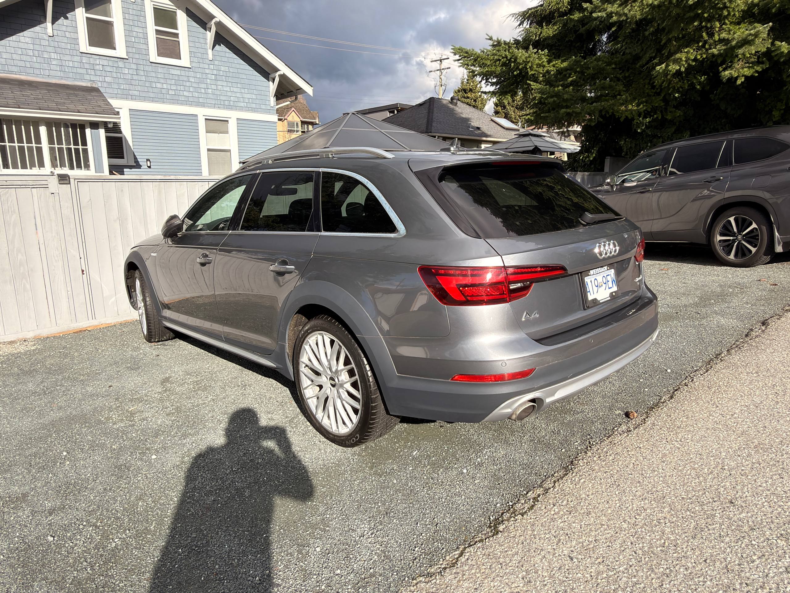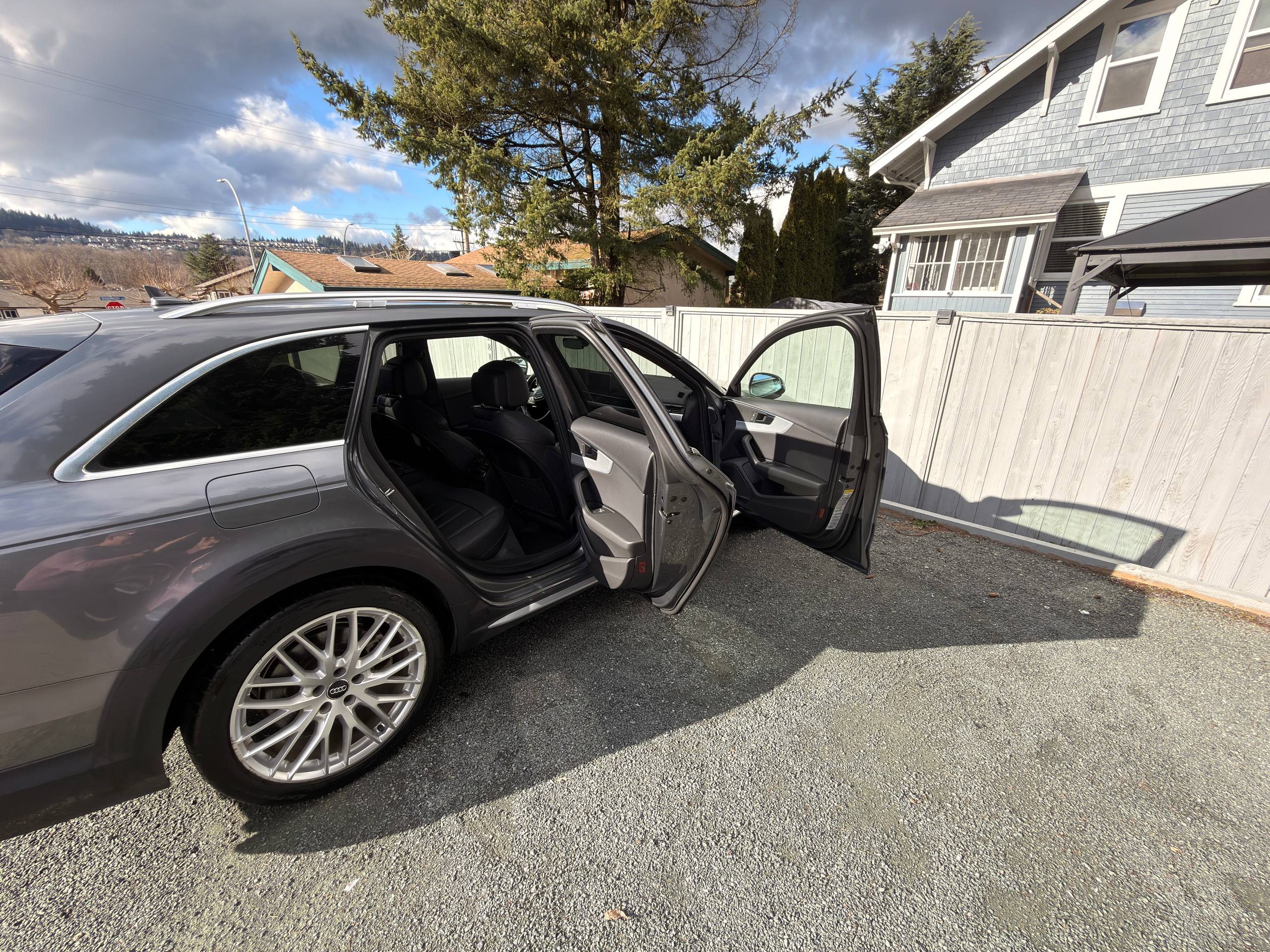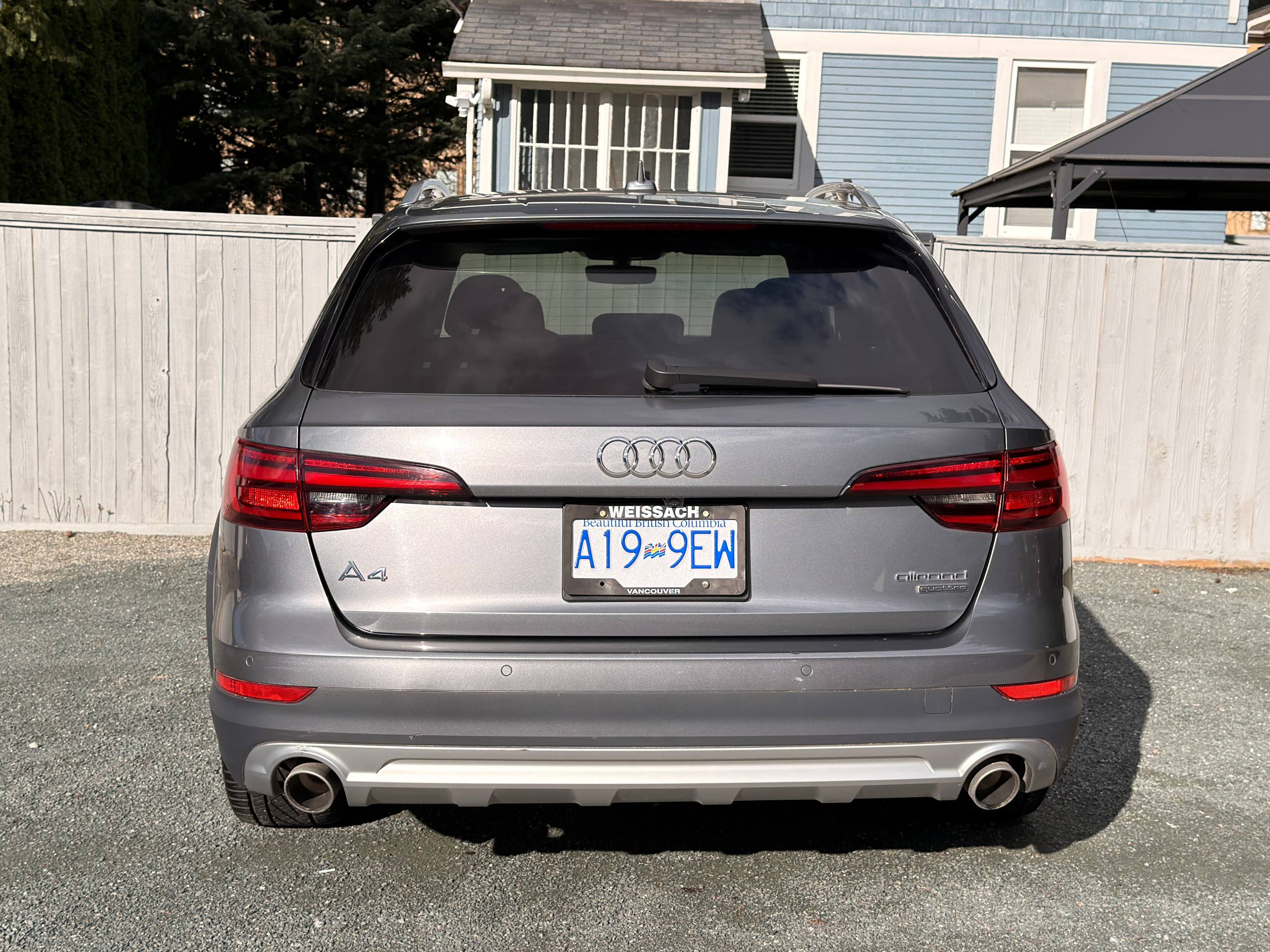 Canadian stock vehicle available in Vancouver, BC. 2018 Audi A4 Allroad Quattro Technic finished in grey with a black interior and low mileage for the year. The photo set shows a panoramic roof, digital cockpit, navigation, rear camera, leather interior, and Quattro all-wheel drive. Suitable for local purchase in Canada or export on request.