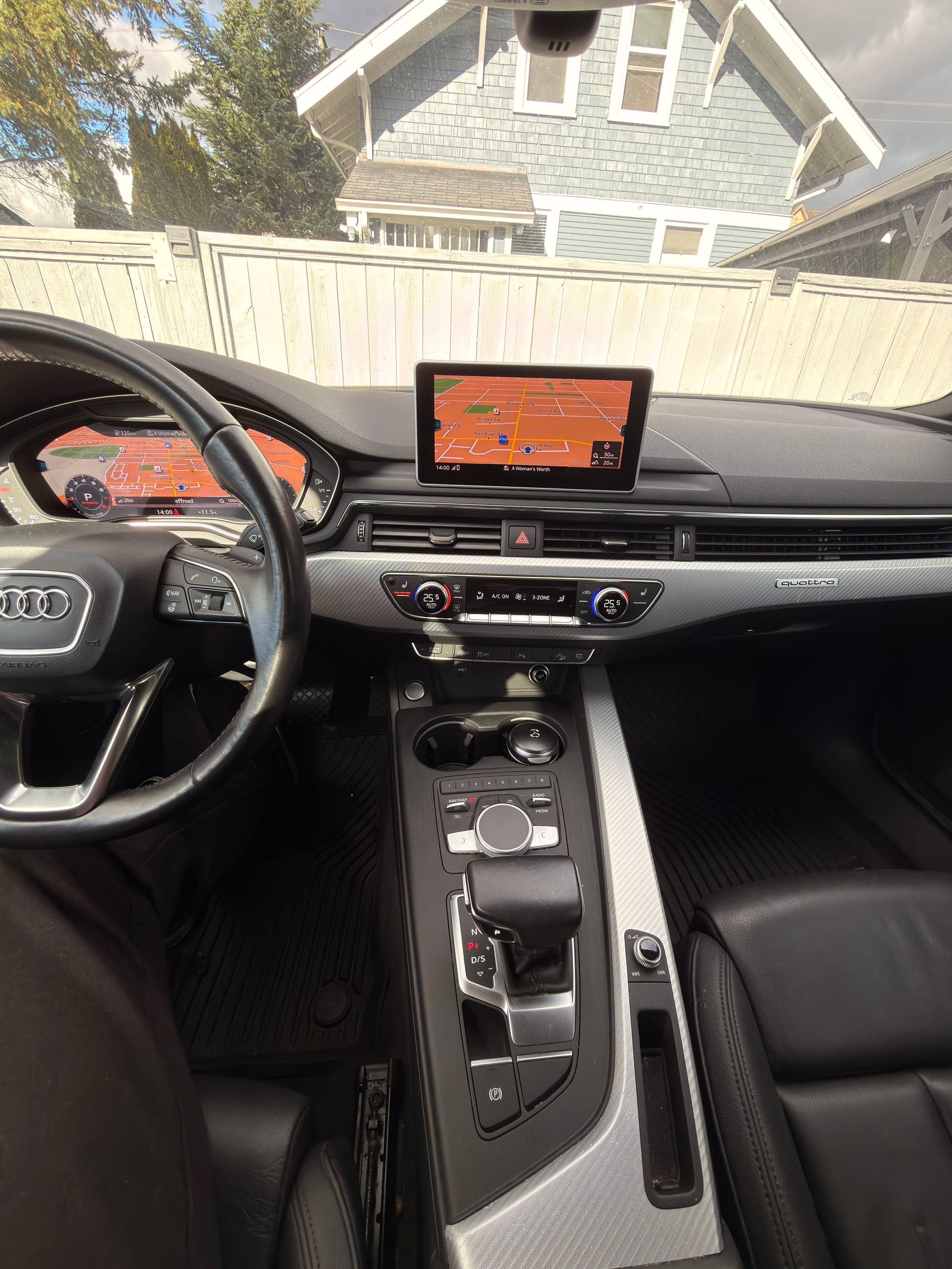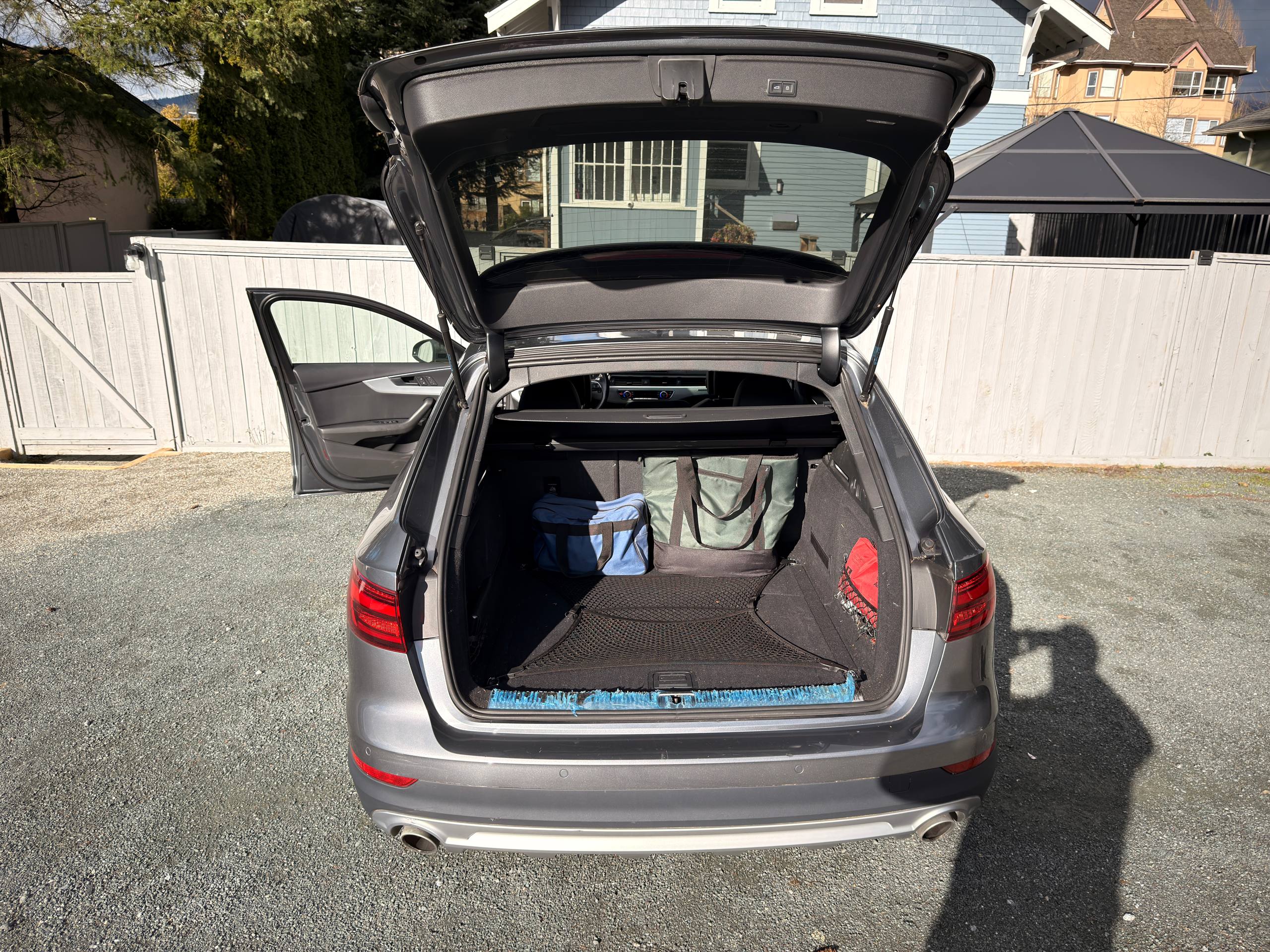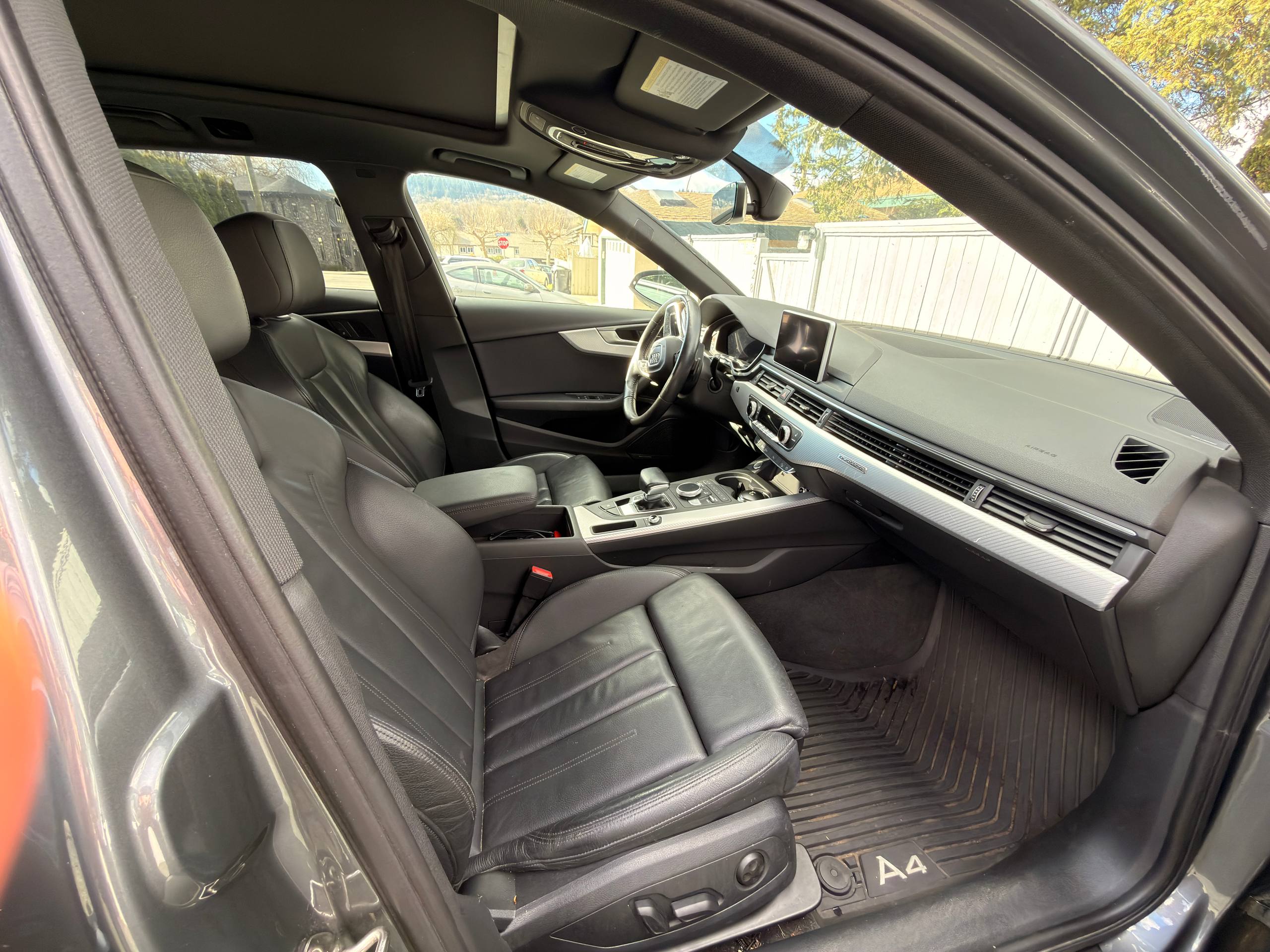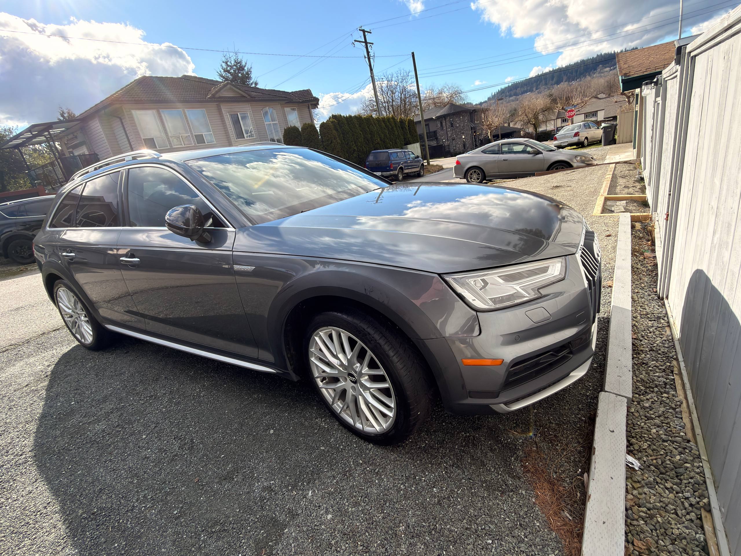 Canadian stock vehicle available in Vancouver, BC. 2018 Audi A4 Allroad Quattro Technic finished in grey with a black interior and low mileage for the year. The photo set shows a panoramic roof, digital cockpit, navigation, rear camera, leather interior, and Quattro all-wheel drive. Suitable for local purchase in Canada or export on request.